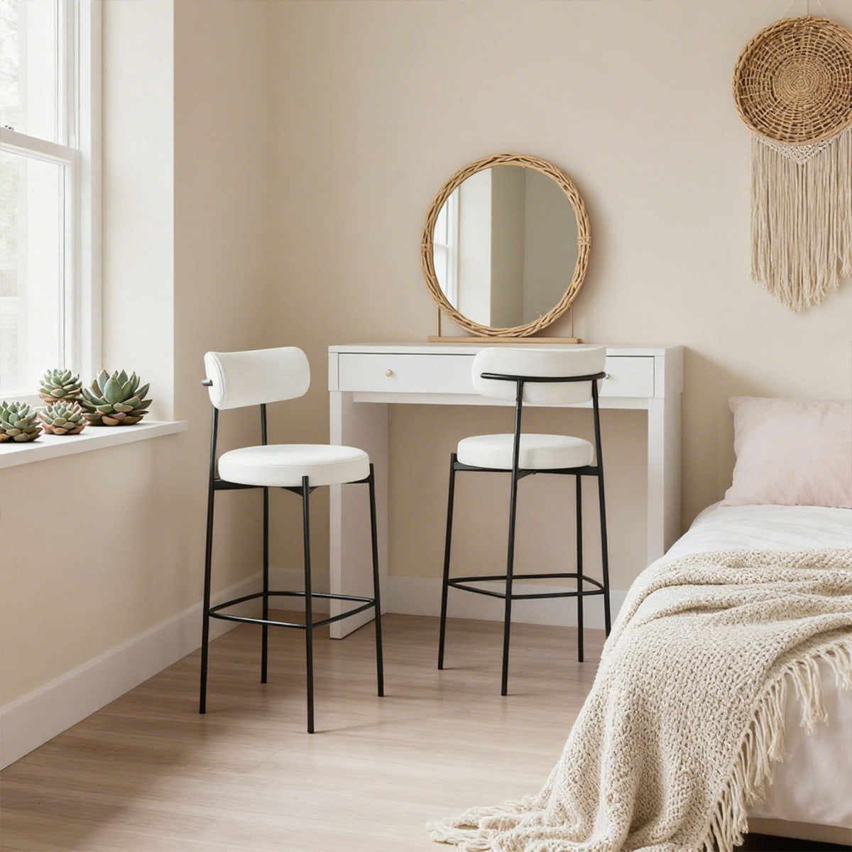 | Upholstery | Kain bouclé putih premium dengan paip hitam untuk kontras elegan |