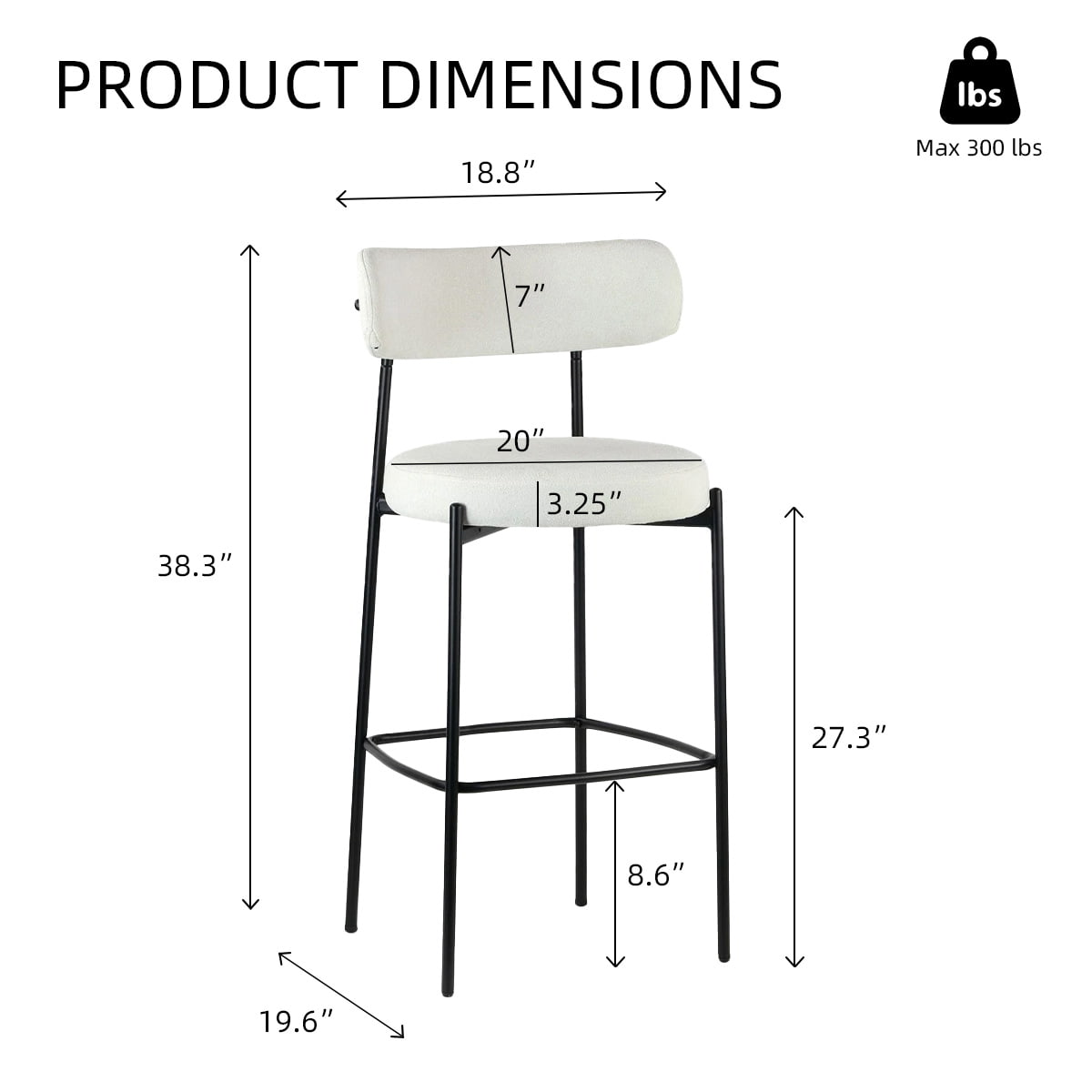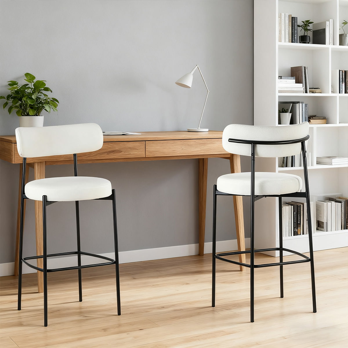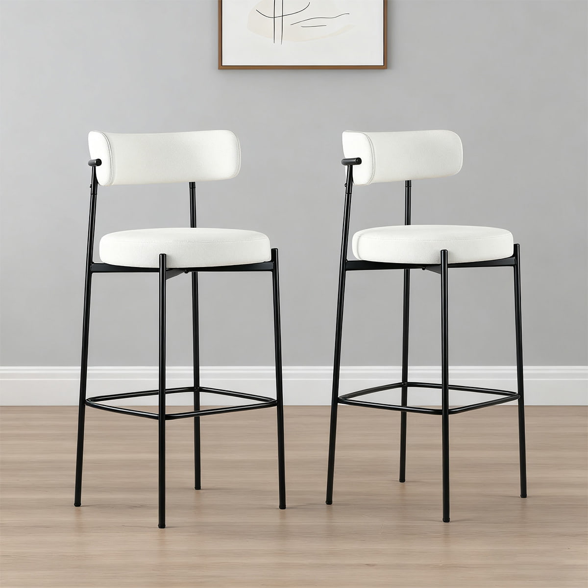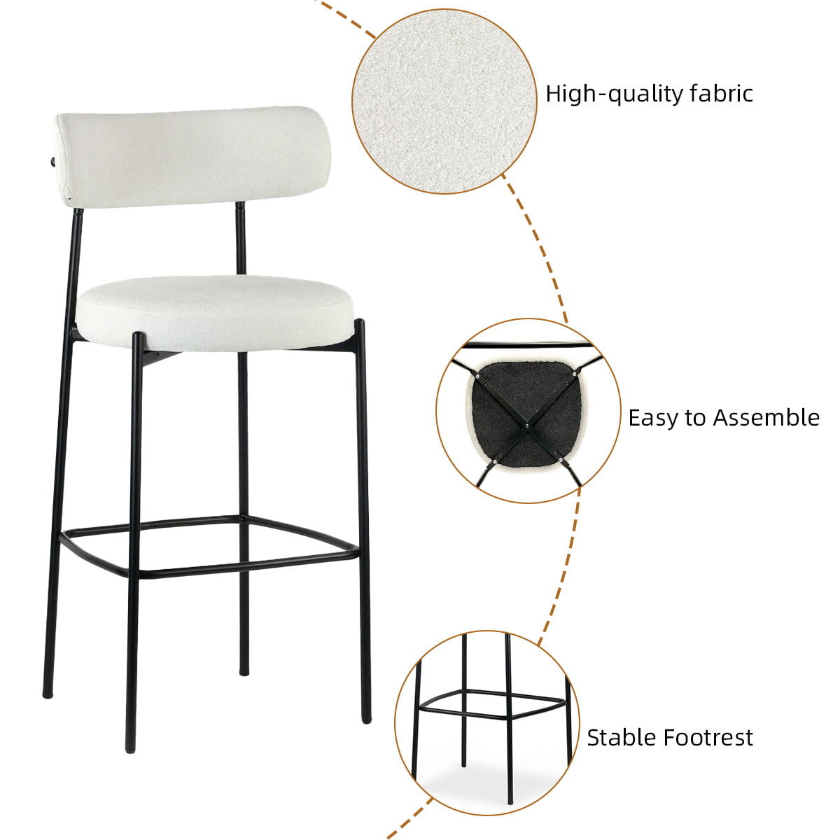 Bangku bar bouclé putih moden dengan kaki logam hitam - kerusi bar ketinggian kaunter atas dengan backrest dan footrest untuk pulau dapur, ruang makan, dan bar rumah