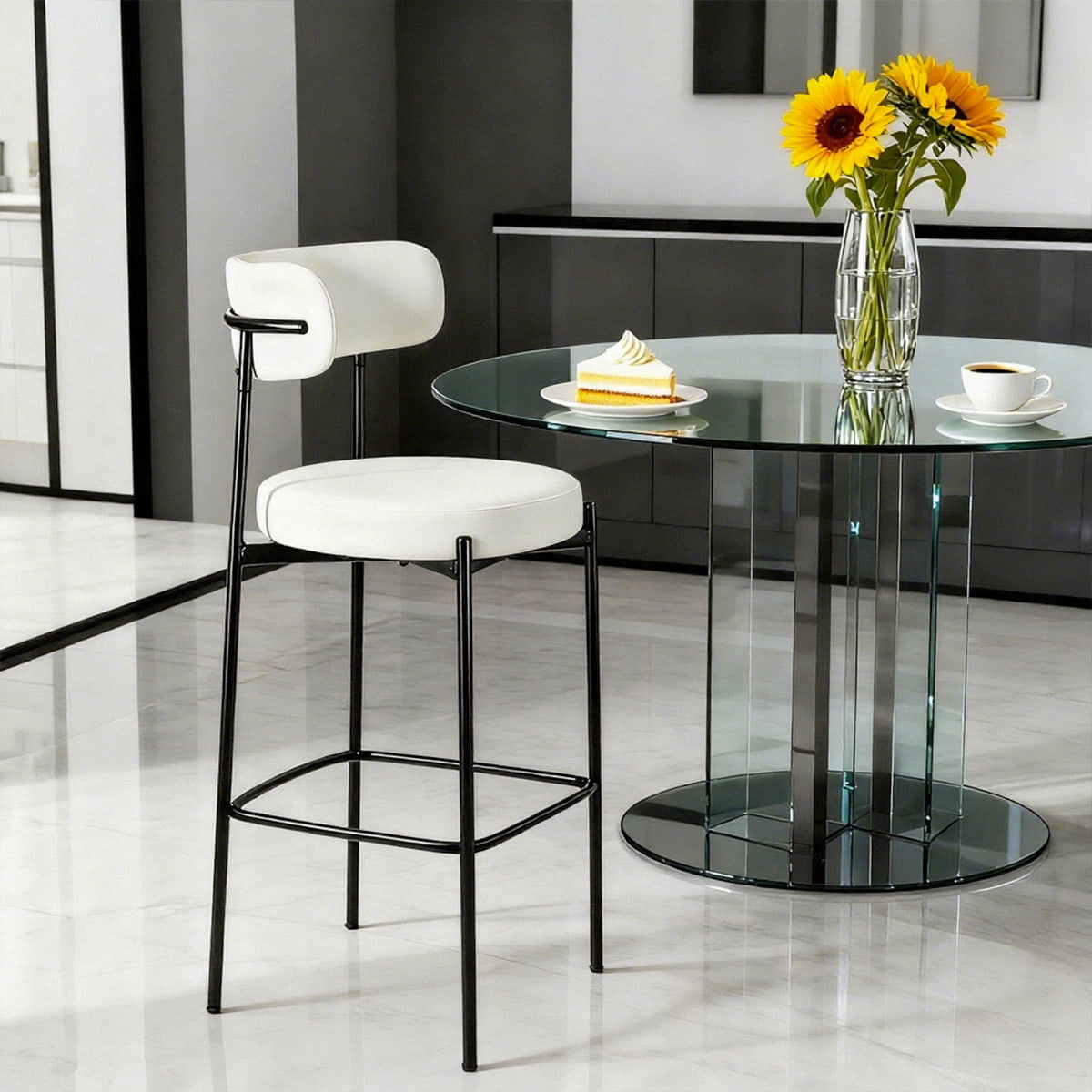Kaunter kaunter bool putih kami direka bentuk untuk keselesaan dan gaya, yang menampilkan bingkai logam hitam tahan lama, kerusi busa berkepadatan tinggi, dan backrest ergonomik-sesuai untuk kaunter dapur, bar, restoran, dan hotel.