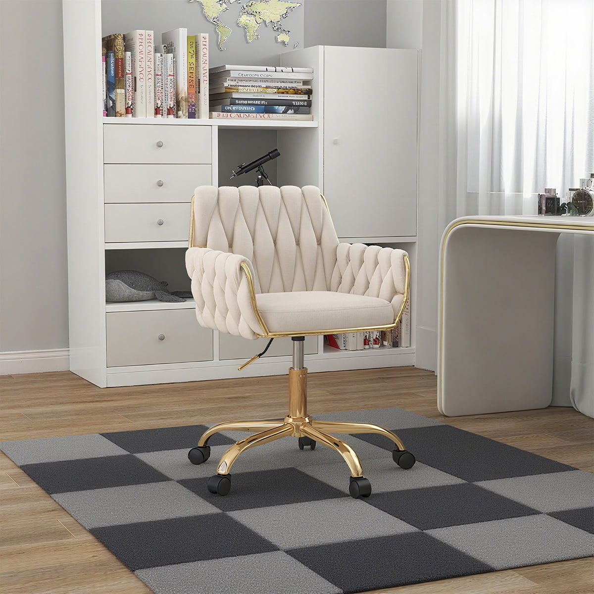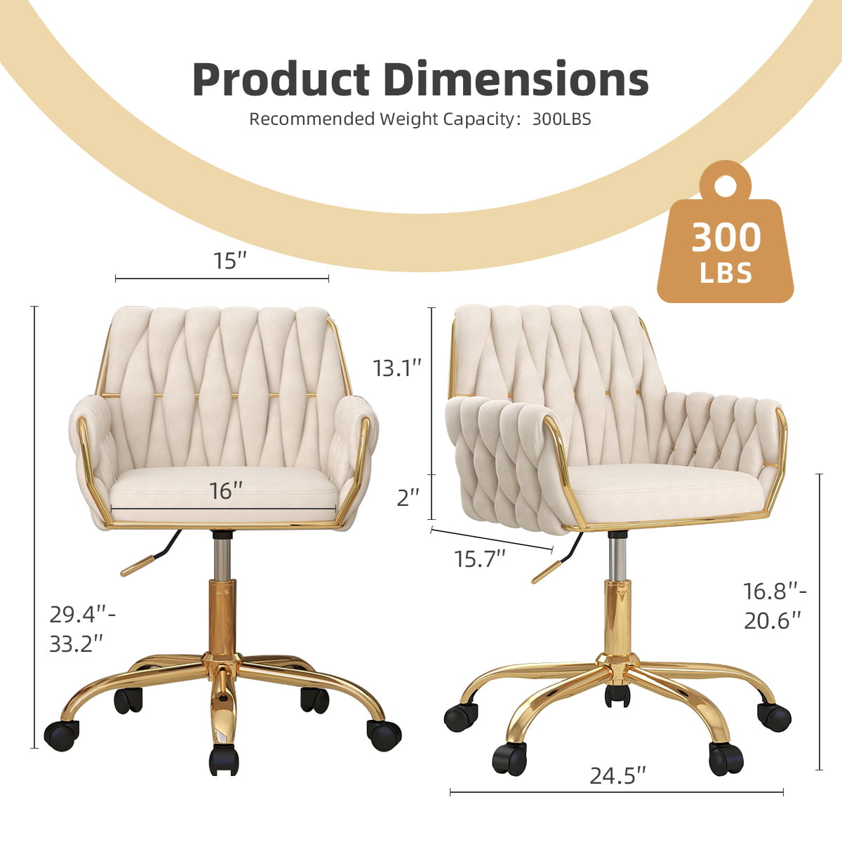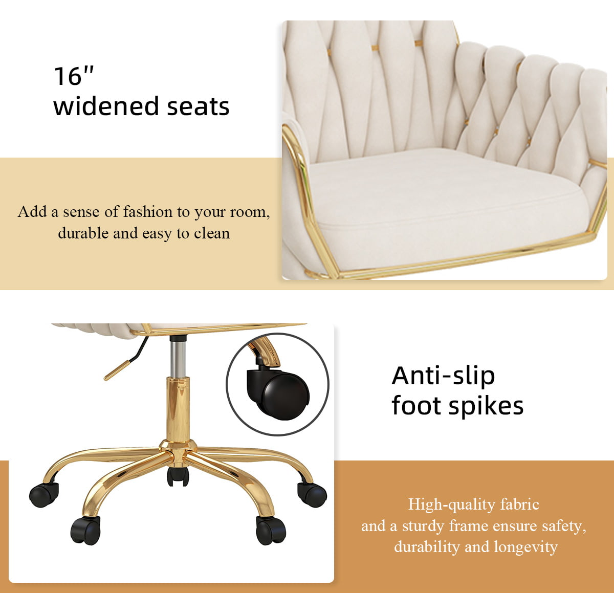 Kerusi Pejabat Rumah Beige Velvet-Kerusi Vanity Moden dengan Pangkalan Emas, Tangan Tangan Tangan & Armrest, 360 ° Swivel Rolling Desk Chair