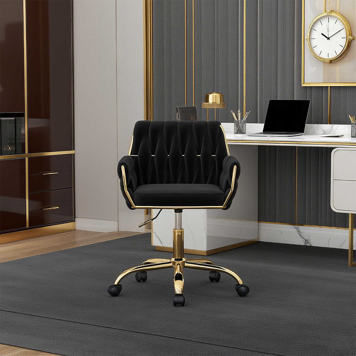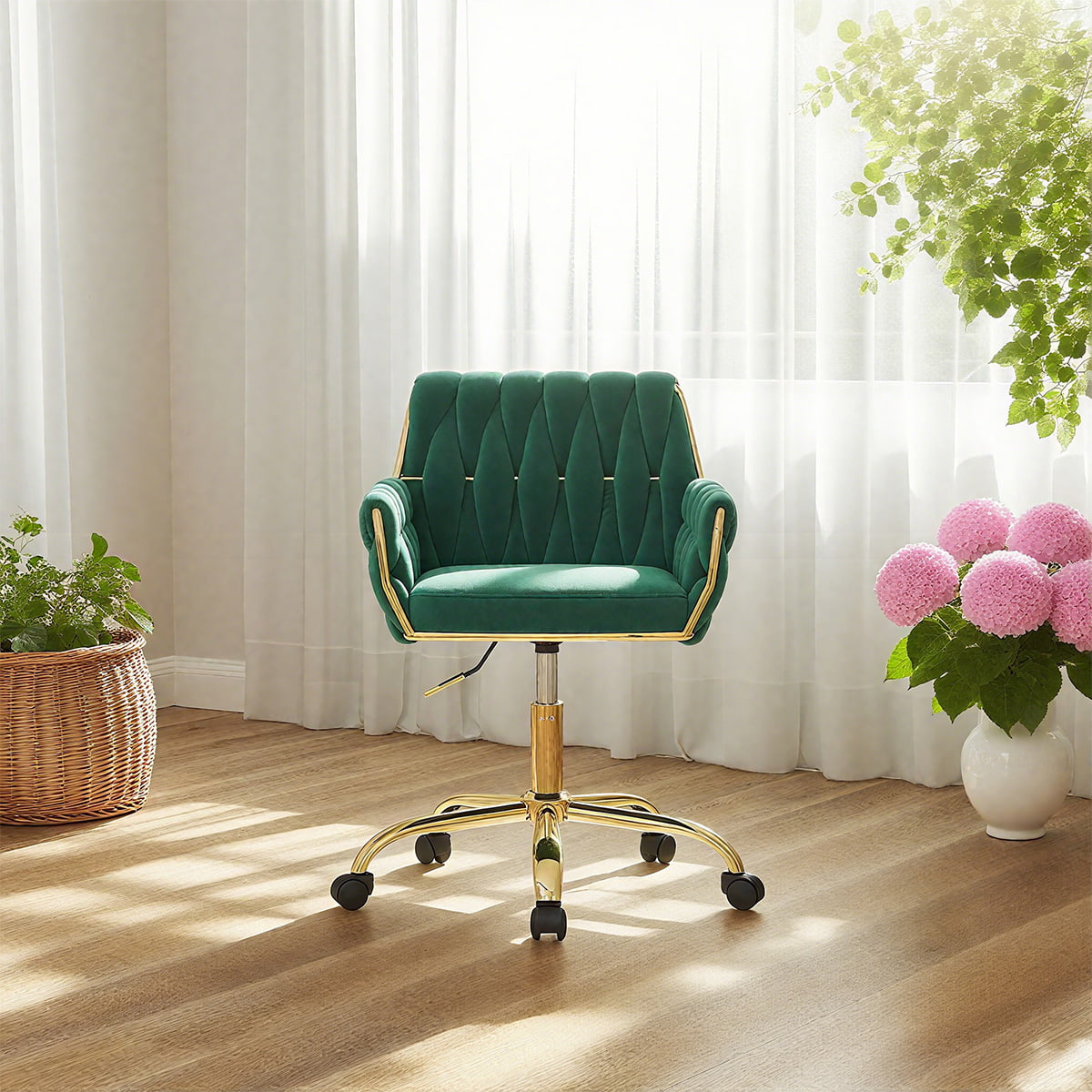 Kerusi pejabat Velvet Beige moden dengan Golden Base adalah kerusi kesombongan yang ideal, kerusi meja pejabat rumah, dan kerusi swivel bilik belajar. Menampilkan upholsteri beludru mewah, backrest tenunan ergonomik, lengan lengan empuk, dan ketinggian tempat duduk laras, ia memastikan keselesaan sepanjang hari sambil meningkatkan hiasan dalaman anda. Pangkalan swivel 360 ° dengan kastor licin menjadikannya serba boleh untuk kerja, solek, membaca, atau permainan.