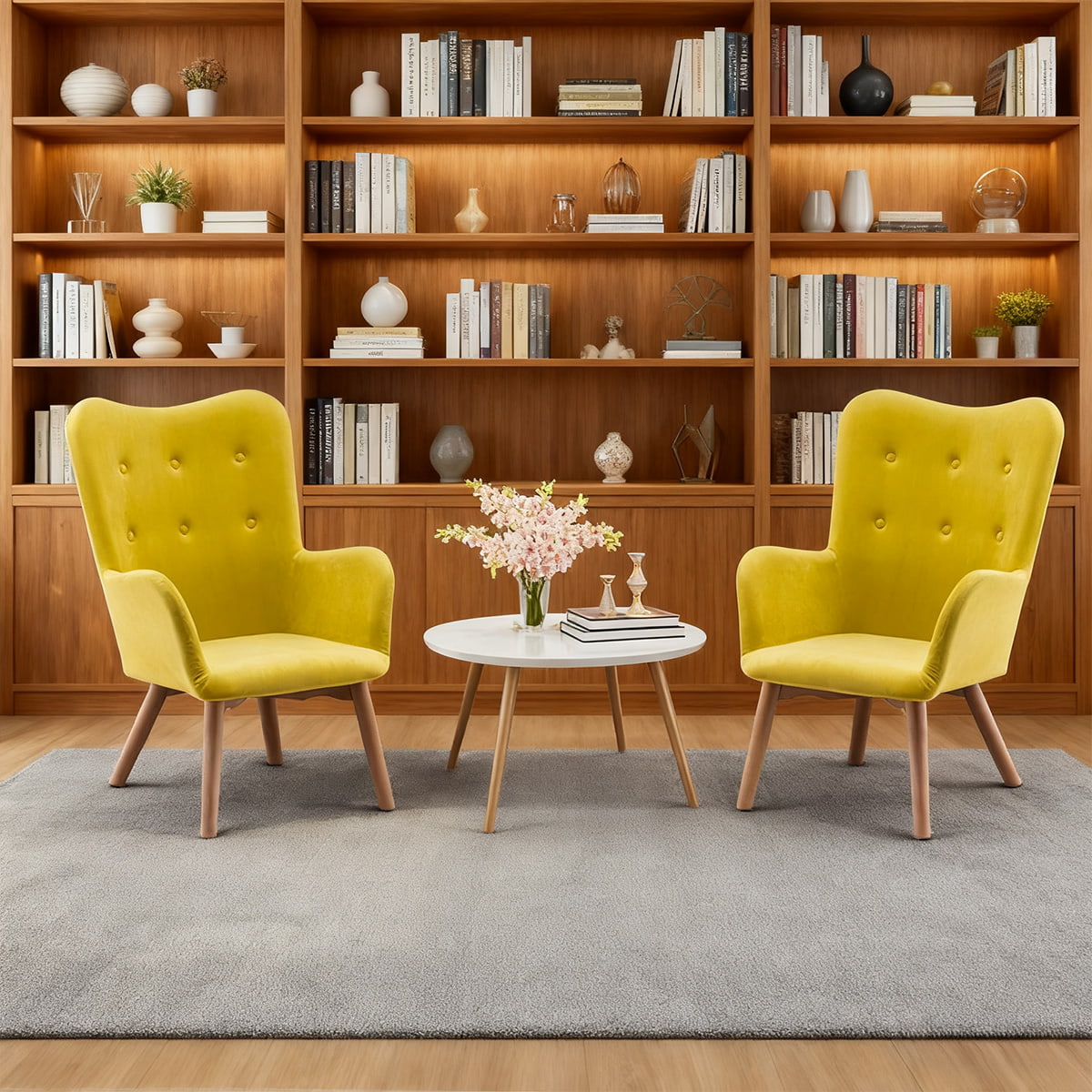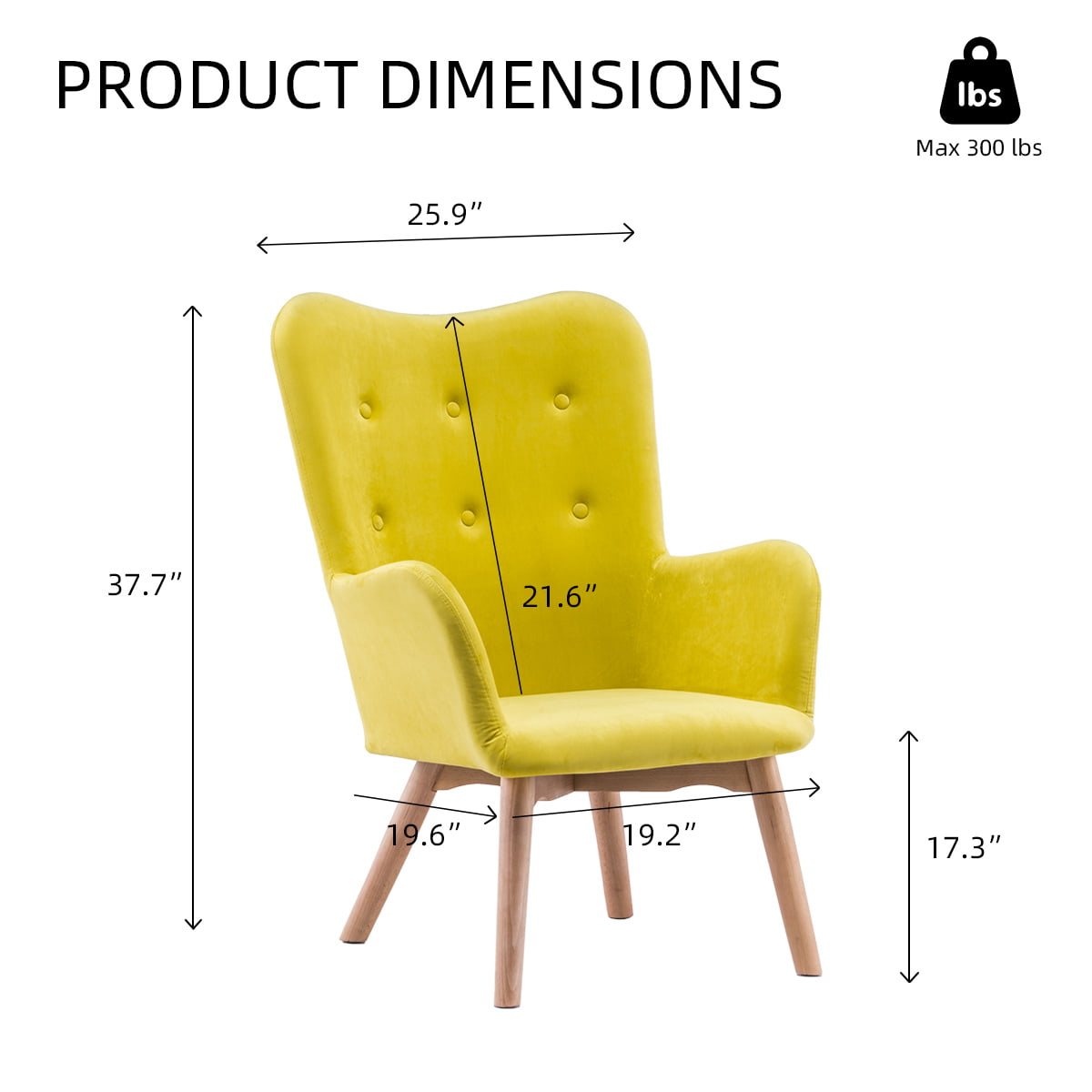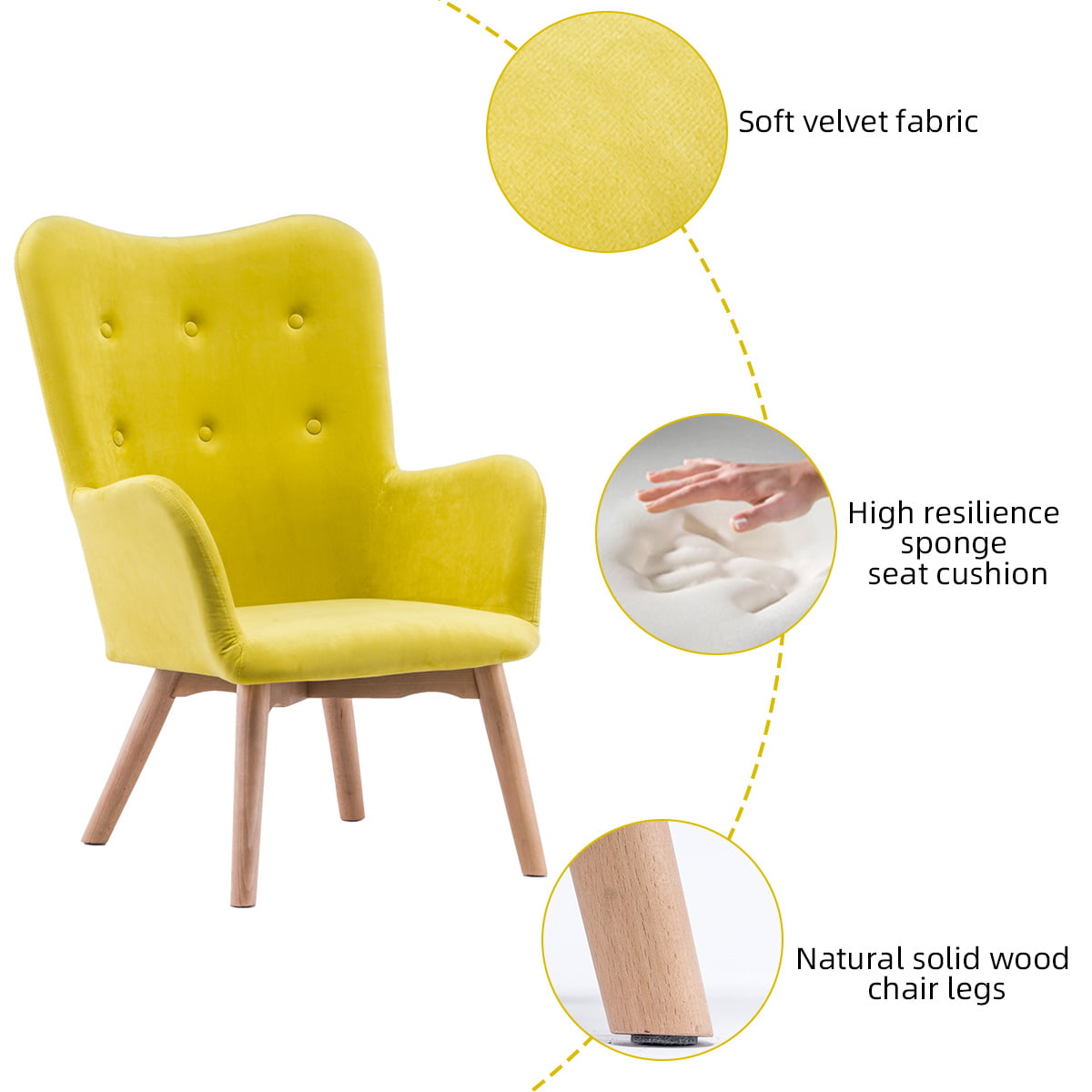 Kerusi Aksen Velvet Kuning Moden - Kerusi rekreasi berumbai sayap dengan kaki kayu & lengan untuk ruang tamu, bilik tidur, atau pejabat