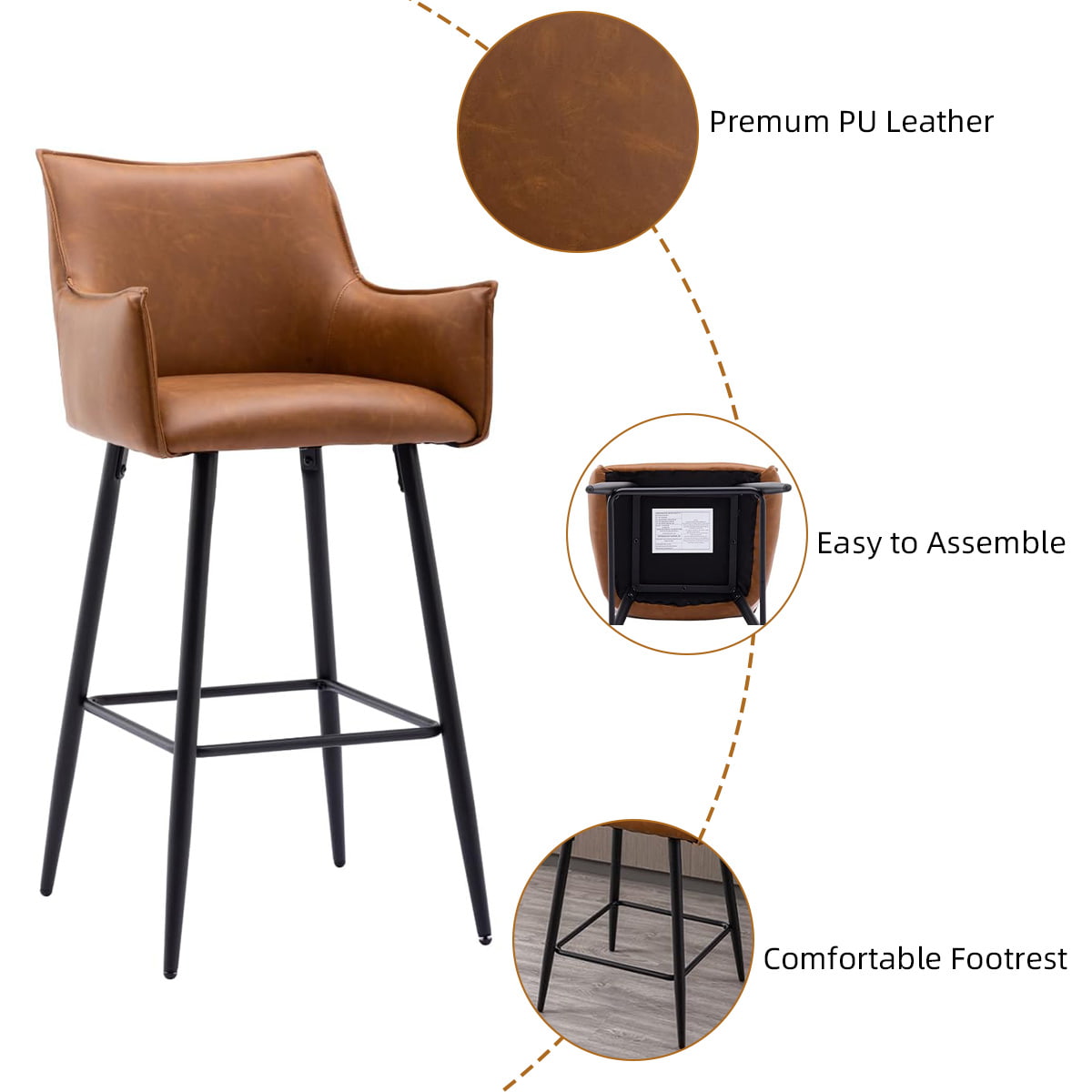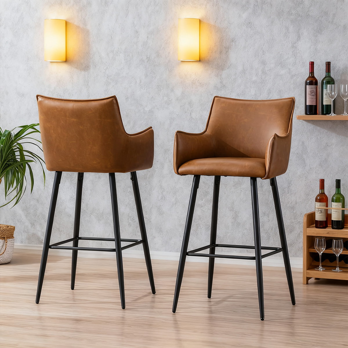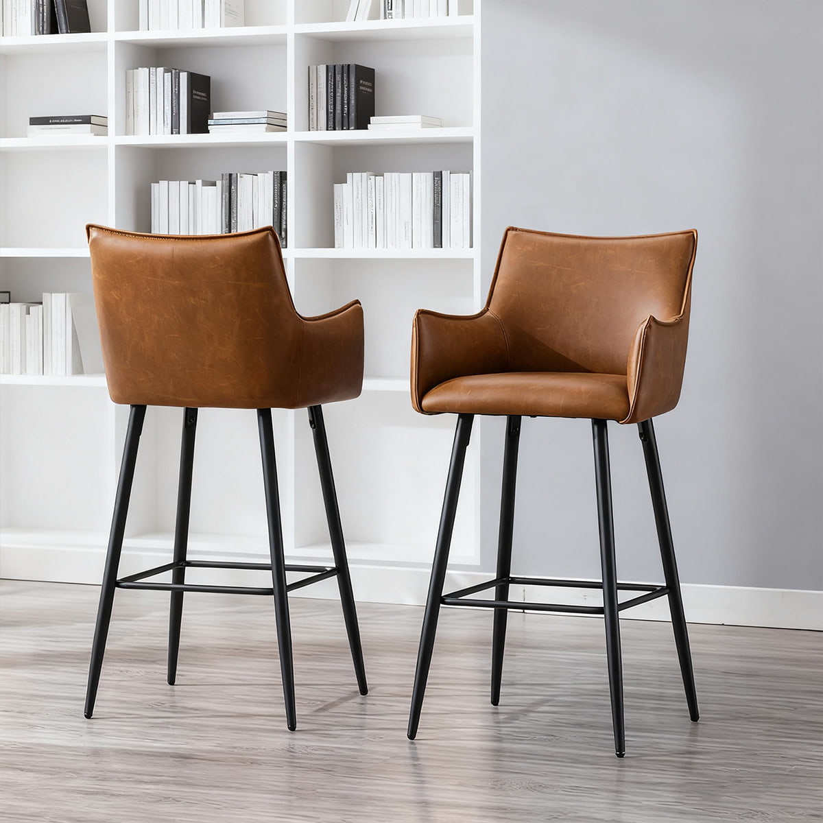 Bangku Kulit Pu Kulit Moden dengan Armrests & Backrest - Kerusi Bar Upholstered Height Height With Black Logam untuk Pulau Dapur, Bistro, atau Home Bar