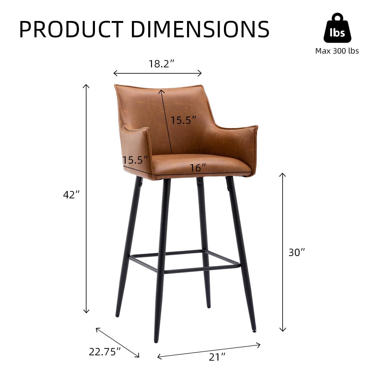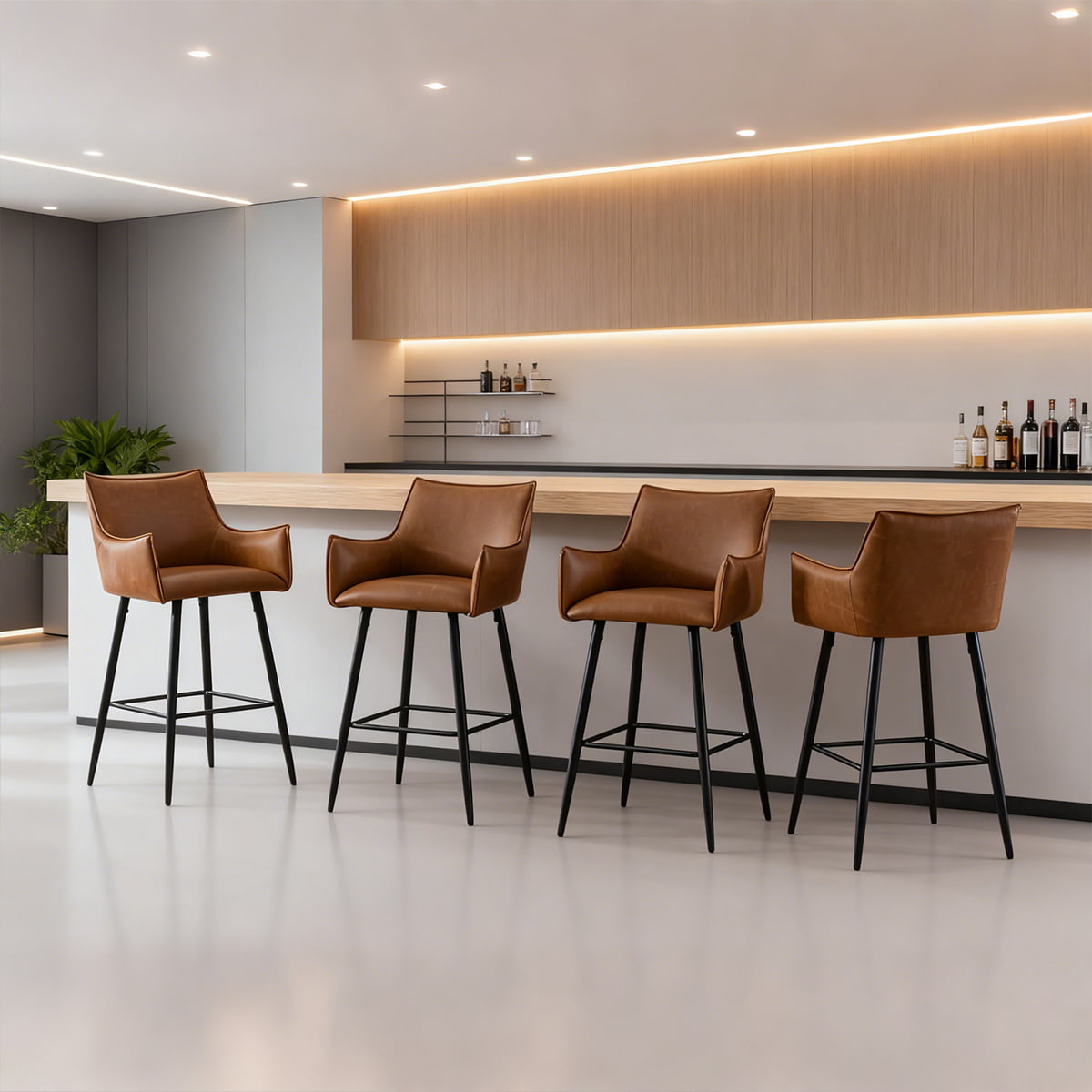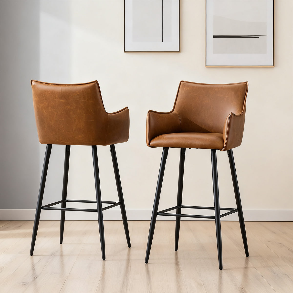 Bangku Kulit Pu Kulit Moden dengan Armrests & Backrest - Kerusi Bar Upholstered Height Height With Black Logam untuk Pulau Dapur, Bistro, atau Home Bar